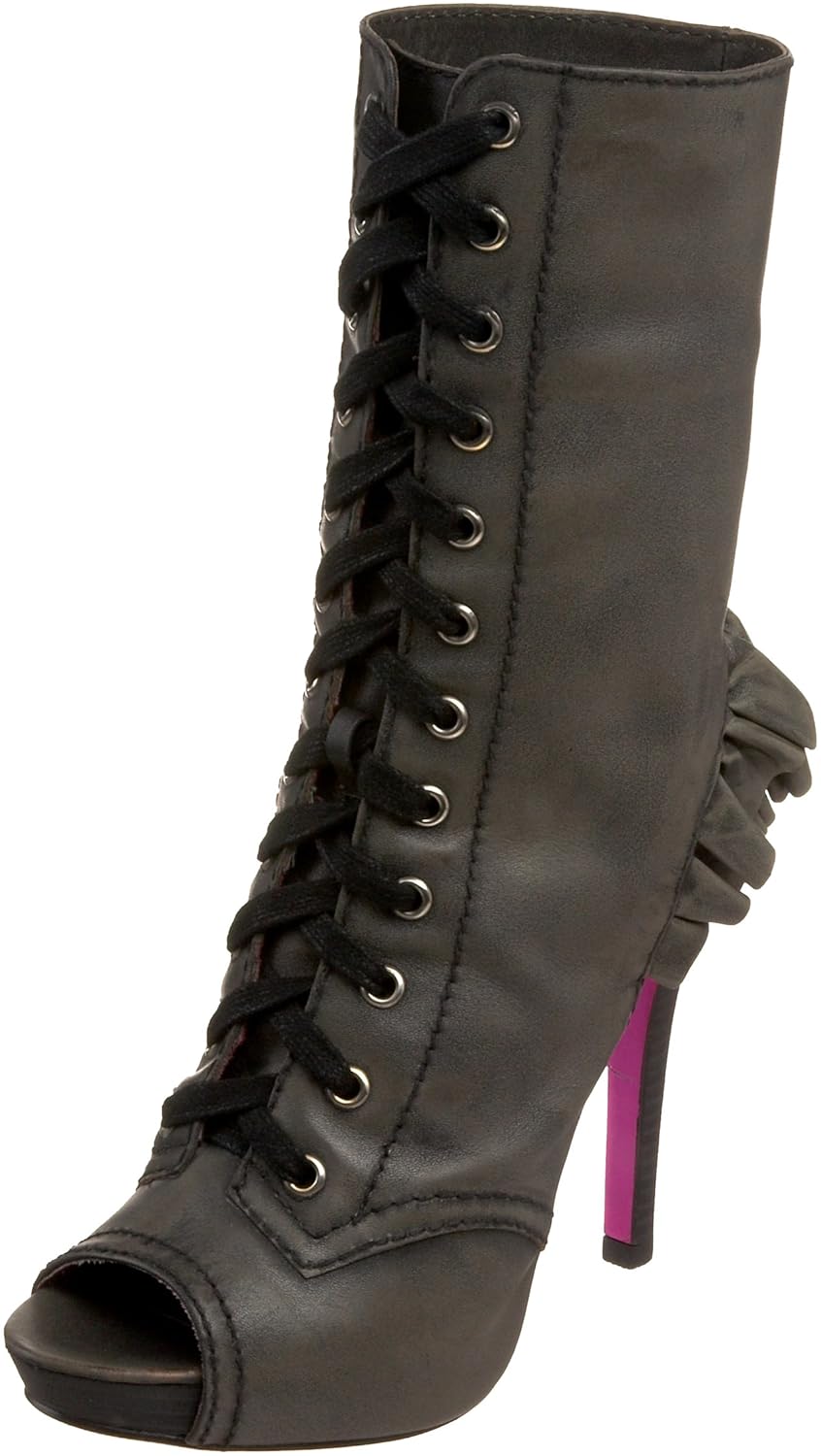 Give your daring style a boost with this leather peep-toe bootie featuring an ankle cut-out with ruffle décor, lace-up closure, leave up or fold over topline and stacked straight heel with corresponding platform. By Betsey Johnson Product Information