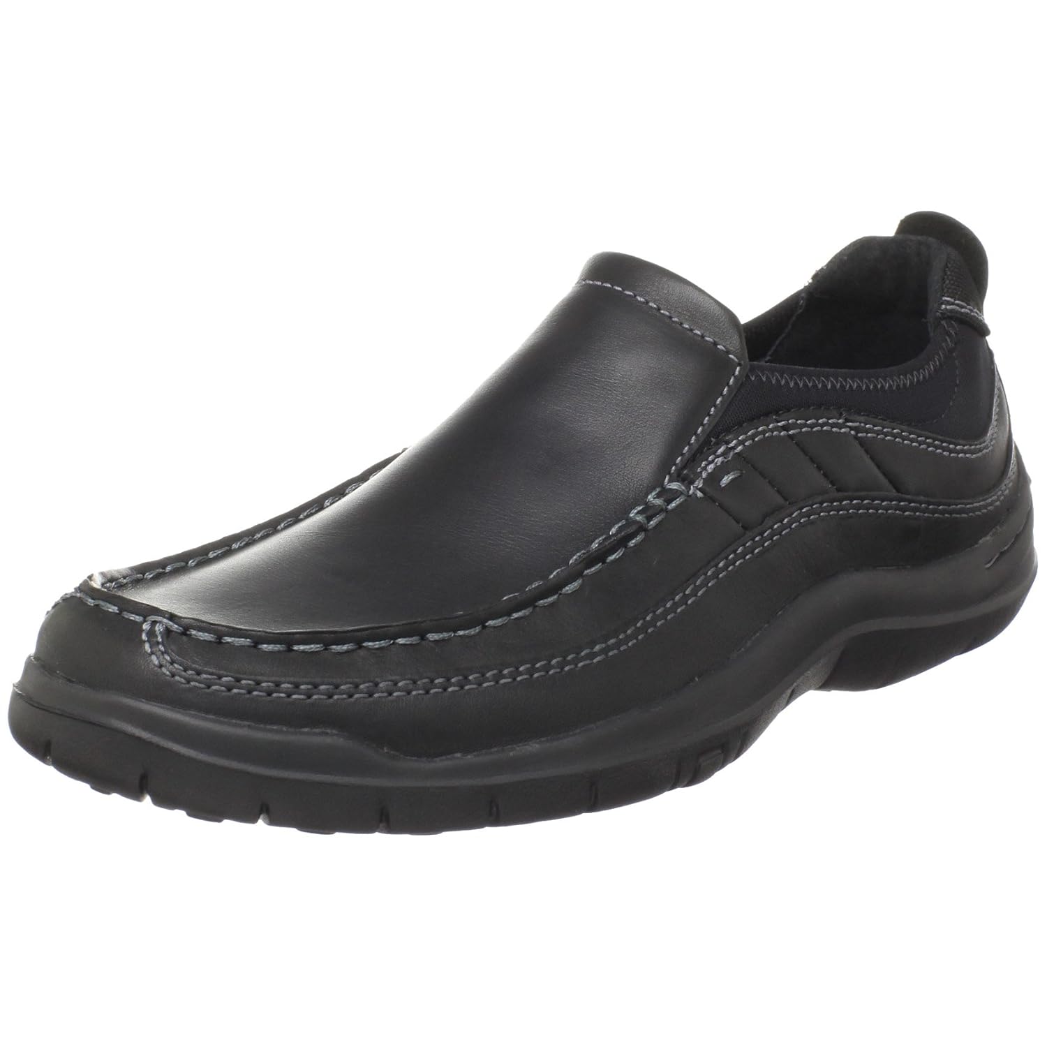 - Leather upper in a casual loafer style with a round, moc toe